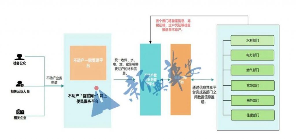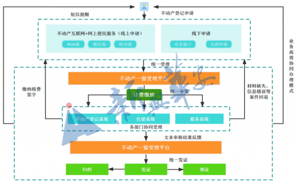 基于不(bu)動(dong)產(chan)一窗受理平臺,與(yu)多部(bu)門開展橫向業務數(shu)據共享,精(jing)化重塑業務流程(cheng)、實現(xian)數(shu)據實時互(hu)通,支撐(cheng)不(bu)動(dong)產(chan)便民(min)服務,延伸(shen)應用。