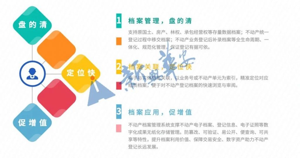 檔案管(guan)理(li)系統基(ji)于統一(yi)的(de)標準,實(shi)現(xian)對不動產登記前、登記中、登記后的(de)電子(zi)檔案、紙質材料(liao)全(quan)生命(ming)周期一(yi)體化管(guan)理(li)。